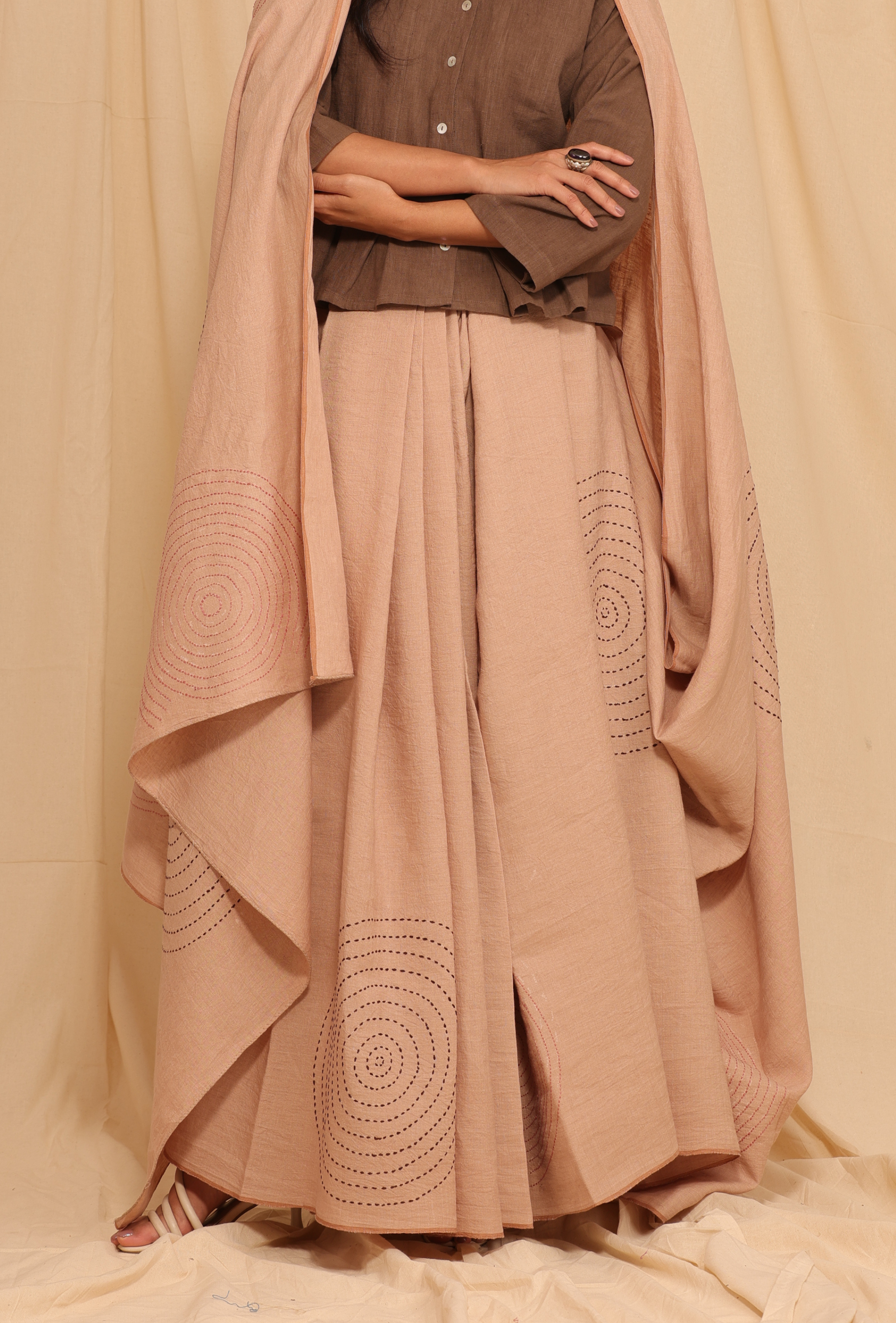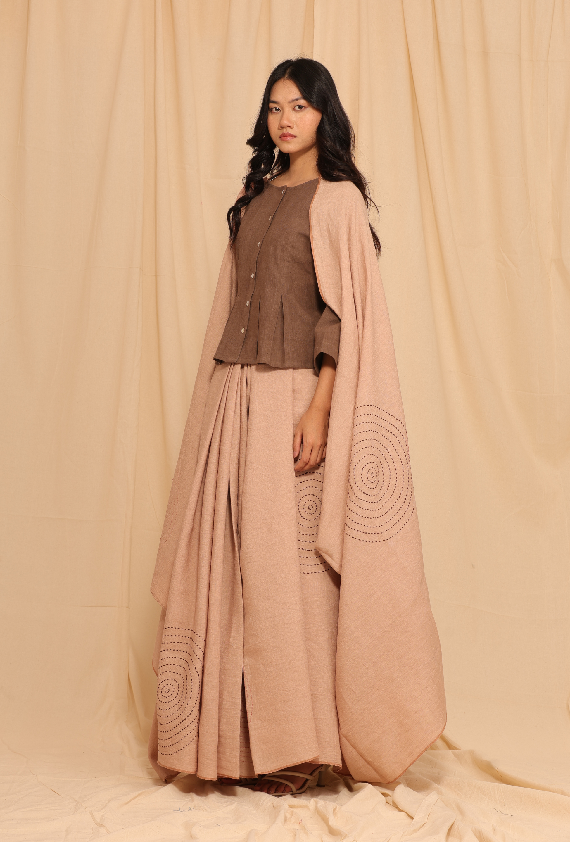 Handwoven in fine linen and naturally dyed in a gentle mocha hue, this saree embodies quiet elegance. Adorned with Tajko embroidery, a Rabari craft from Kutch, the saree carries subtle circular motifs that add rhythm and movement to its minimal surface.
