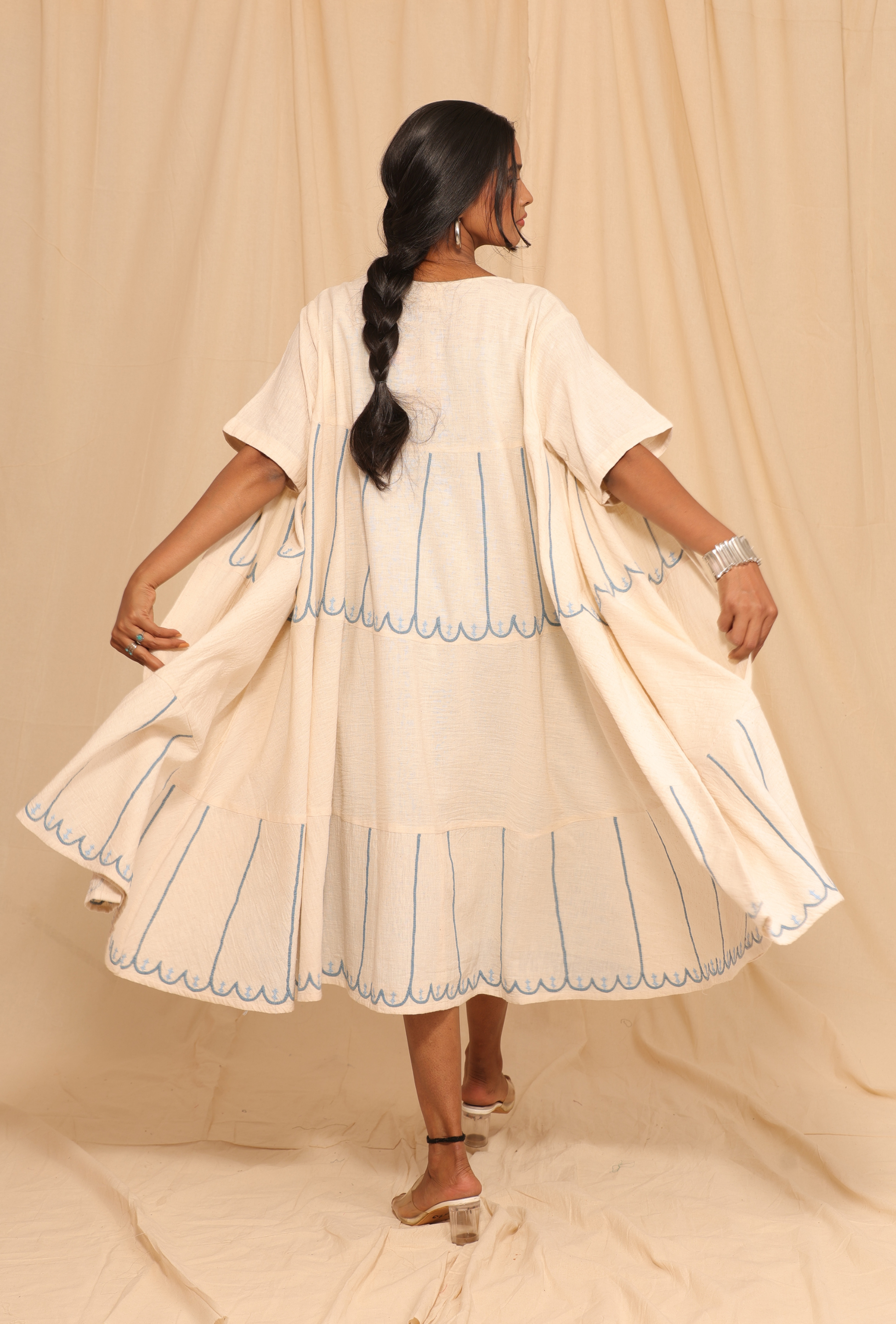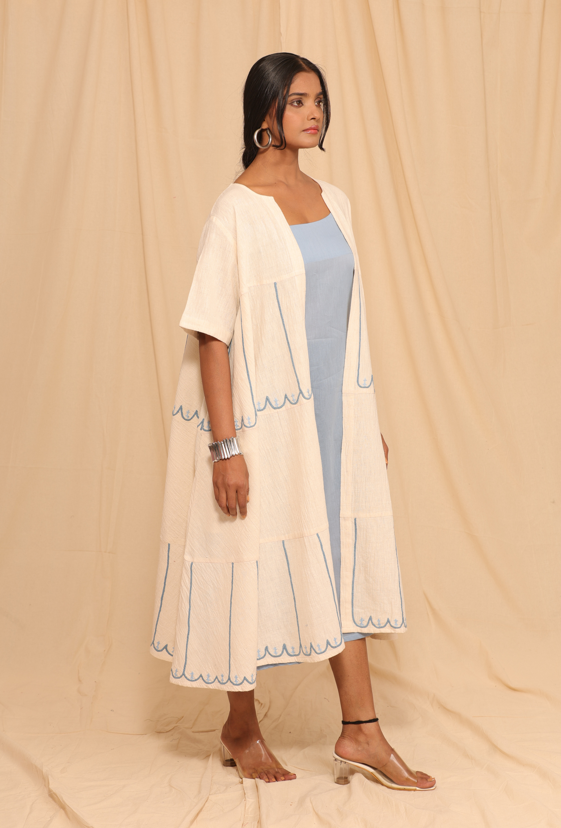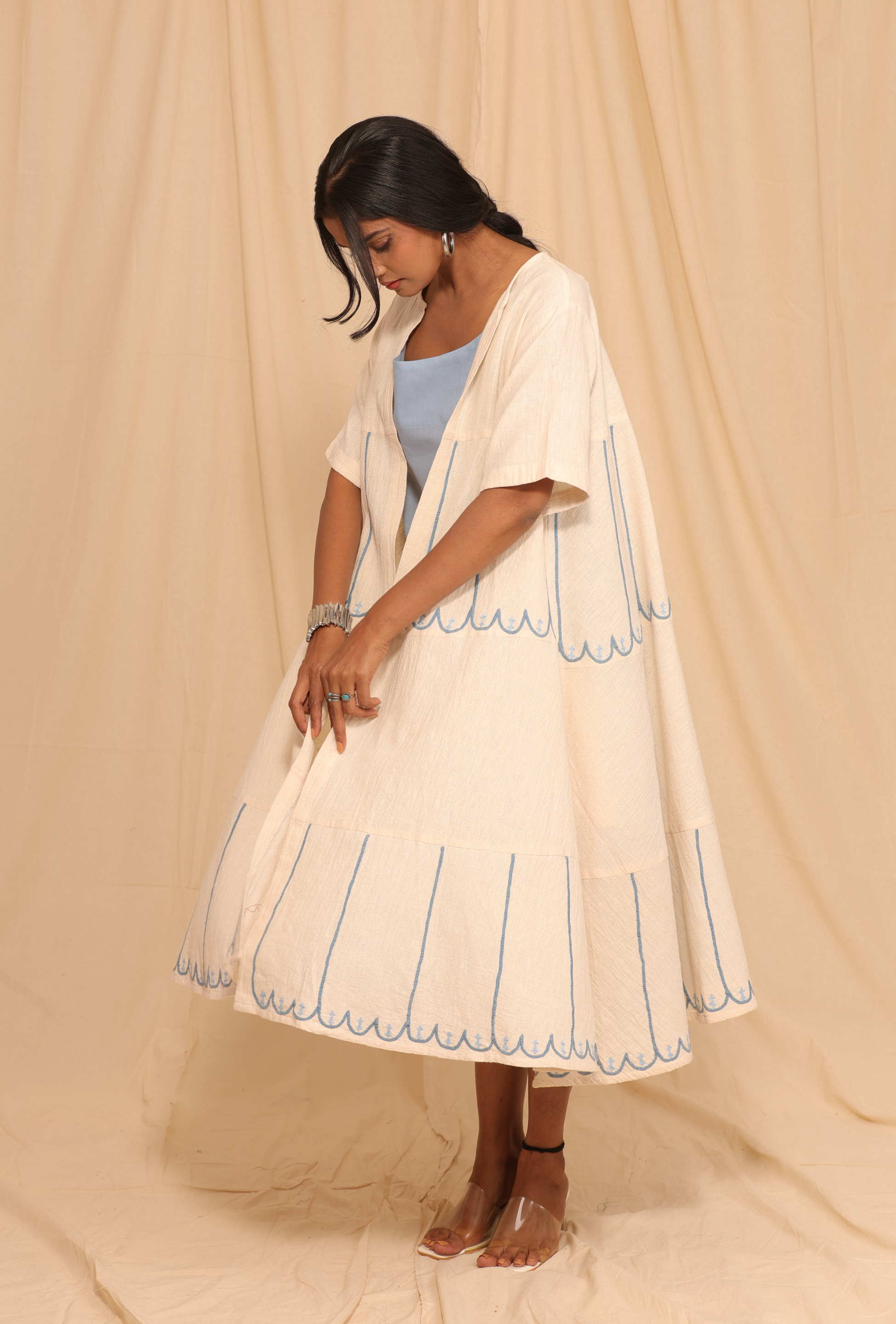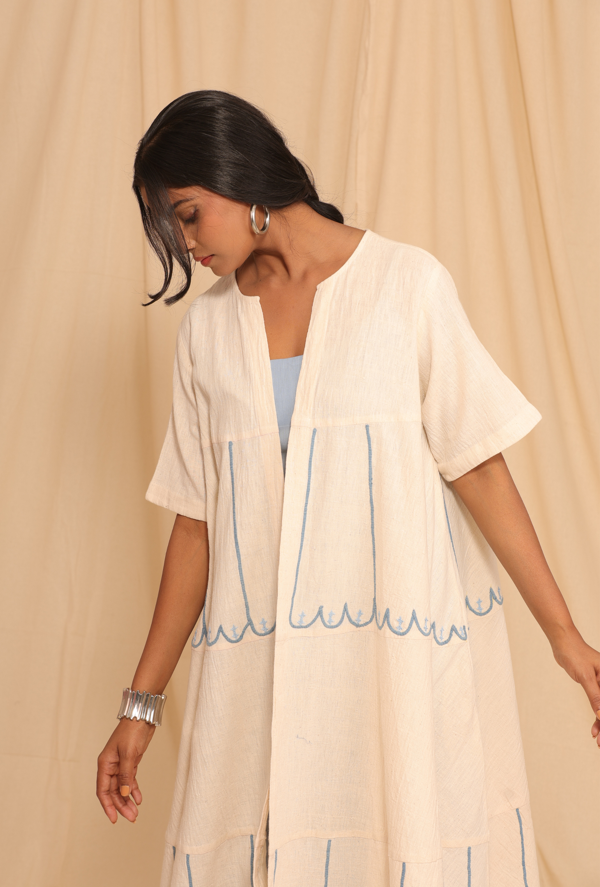 Crafted in soft, breathable Kala cotton, the White Bella Shrug is an ode to artisanal elegance. Featuring delicate katab embroidery in soft blue strokes, the shrug flows with ease and grace. Its relaxed silhouette and open-front design make it a versatile layering piece, perfect for conscious wardrobes that embrace both comfort and craft.